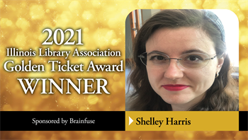 The Illinois Library Association’s Youth Services Forum is presenting this year’s Golden Ticket Award to Shelley Harris, Children’s Librarian at the Oak Park Public Library. This award is presented annually to an individual who has made an outstanding contribution in library services to young people in her or his local community. This year’s award is again being sponsored by Brainfuse.