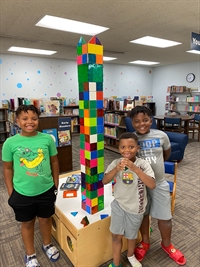Description: Brothers Brad, Wayne, and Jaden are Hillside residents who built a tower out of magna-tiles in the library's newly renovated children's area.