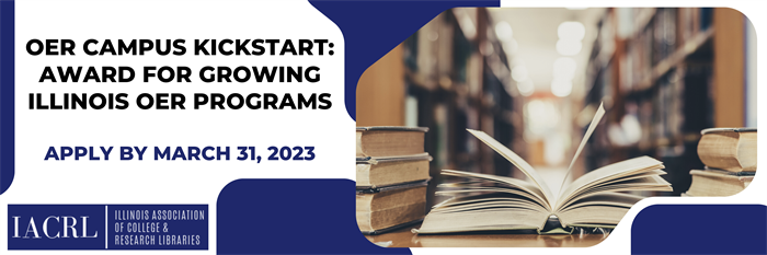 The Illinois Association of College & Research Libraries (IACRL) Awards Committee is excited to announce that they are opening applications for the OER Campus Kickstart: Award for Growing Illinois OER Programs. If you have been looking for a way of getting financial incentive to your faculty to take on OER projects, this is an opportunity for you.
