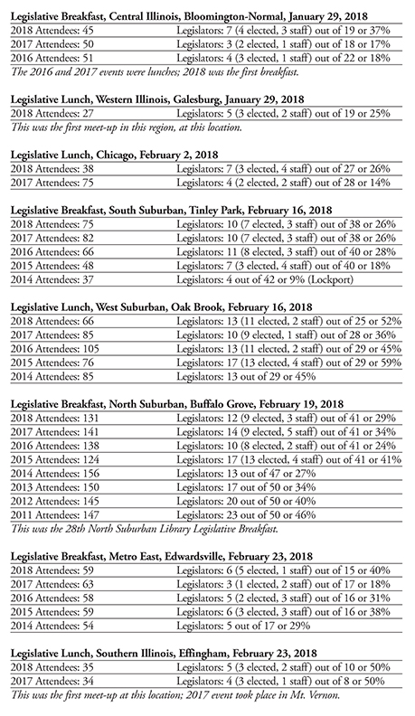 The 2018 meet-ups series was characterized by a slight decline in attendee participation over 2017, but a sizable increase in legislator participation, which remains high with a majority of legislators appearing in person rather than sending staff. In all, 476 people attended the events compared to 530 in 2017, representing a 10 percent decrease but still higher than the 418 who attended in 2016. Legislator participation totaled 48 in 2017 and 65 in 2018, a 35 percent increase. Participation patterns may be due to attendees’ extreme concern about the state of Illinois’s budget in 2017, and legislators’ interest in connecting with constituents in an election year in 2018. Thanks to all who attended, and special thanks to the area library volunteers who work so hard to make these worthwhile events happen. We look forward to seeing results from deepening our relationships and connections to each other.