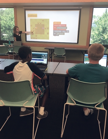 The public library curriculum meets for three hours for six or seven sessions. Since children drop in and out as their impulse and summer schedules suit, that program is designed to allow success for participants who are there for a single session, a few sessions, or the entire program; our sessions are therefore thematically focused. with topics such as Algorithms, Loops and Conditionals, Functions, Variables, and Debugging, and a concluding showcase. Each session includes an unplugged segment where we teach participants the concept without working on the computer; that’s our opportunity for creativity, so we’ve used approaches such as making paper airplanes, singing “Jingle Bells,” standing in front of the group and twirling around, and MadLibs to teach concepts. Then there’s a segment where they work on a specific lesson on Code.org, followed by lab time where they can work on their own.